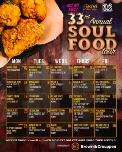 In observance of Black History Month, Hot 103 Jamz presents the 33rd Annual Soul Food Tour! Monday – Friday, 11am – 1pm. through the month of February. Experience the best soul food and amazing daily soul food specials at various restaurants throughout Kansas City! Brought to you by: Brown & Crouppen Download the Calendar HERE Schedule is subject to change
